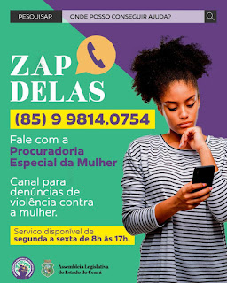 A Assembleia Legislativa lançou nesta segunda-feira (14/06) a nova ferramenta Zap Delas da Procuradoria Especial da Mulher. O canal de comunicação direta por meio de aplicativo de mensagens é destinado ao atendimento de mulheres em situação de violência no Ceará. O serviço vai funcionar de segunda a sexta-feira, das 8h às 17h, com o número (85)9-9814-0754.