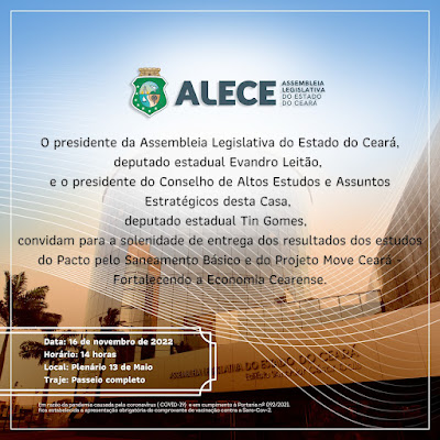 A Assembleia Legislativa vai entregar à governadora e ao governador eleito a produção do Conselho de Altos Estudos, que são o Plano Estratégico para o Saneamento Básico no Ceará e o resultado do Projeto Move Ceará, que durante um semestre promoveu a escuta do setor produtivo do Ceará. O evento será dia 16 de novembro.